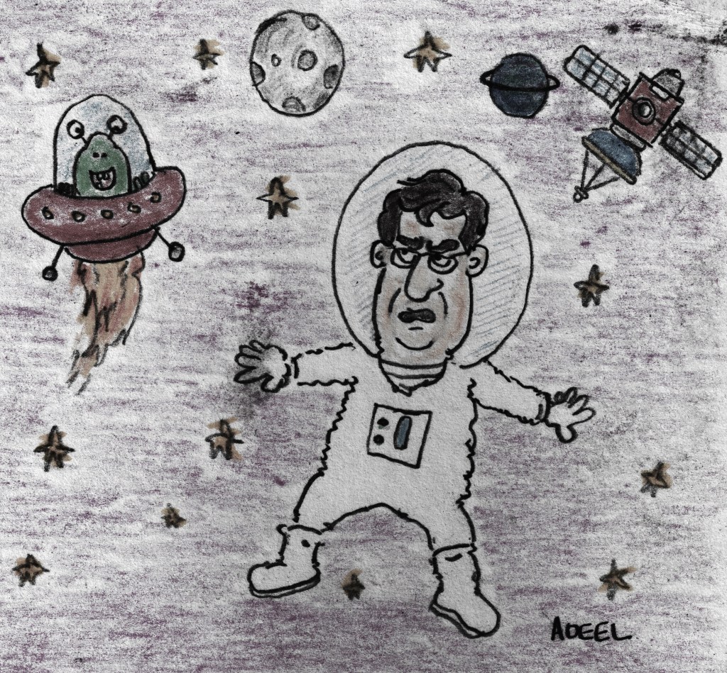 Mr. Mehboob has his laptop open, pretending that he’s calculating, tracking the cosmos, measuring light-years, mapping infinity like some moonlighting intern at NASA, but I know, he’s just playing Minesweeper.